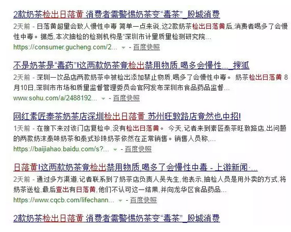 最近,深圳食品药品监督管理部门在某网红店检测出两款“奶沫泰味奶茶”和“泰式珍珠奶茶” 添加了违禁物质——日落黄。大量媒体报道时称,奶茶添加有害色素,食用会导致慢性中毒,这让喜欢奶茶的人们忧心忡忡。