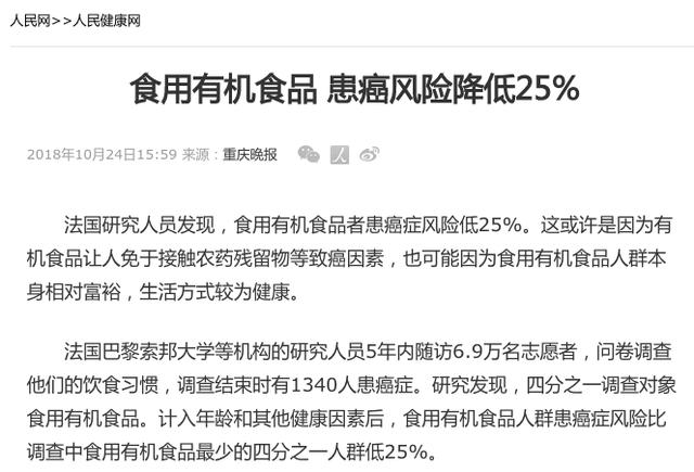 大量在媒体在报道时称,食用有机食品 患癌风险降低25%。甚至一些说法说吃有机食品能预防癌症。