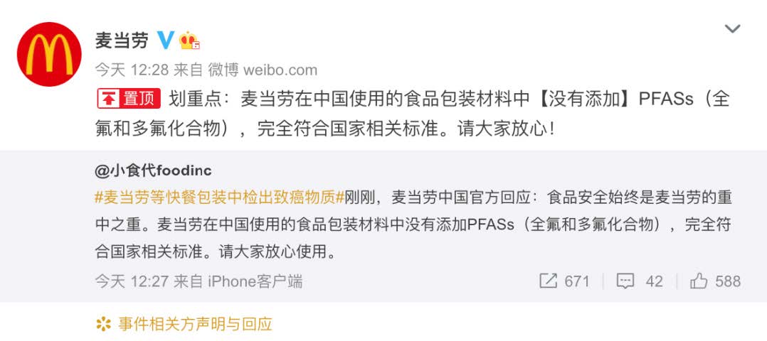 目前,麦当劳和汉堡王均已回应:在中国使 用的食品包装材料中没有添加 PFASs,完全符合国 家相关标准。请大家放心!