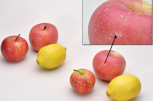 没有打蜡的水果(图左)和打了蜡的水果(图右)同样光鲜亮泽。从打了蜡的苹果上刮出的蜡屑(右上)。