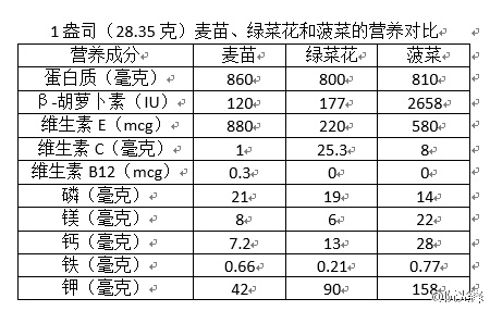 科学家对麦苗的营养价值进行了分析,如下表。我们可以看到,麦苗的维生素E含量有较大优势,但是,β-胡萝卜素含量却低于菠菜,维生素C含量也很低,其他营养素并没有多大差异。综合,英国英国国家医疗服务体系(NHS)和英国营养师协会(BDA)都认为,麦苗跟绿菜花、菠菜等普通蔬菜的营养价值并没有什么特别的优势。