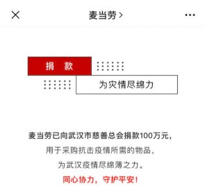 麦当劳作为餐饮行业的领头羊,积极参与到 抗击疫情的工作中。1 月 24 日麦当劳中国第一时 间向武汉慈善总会捐款 100 ...