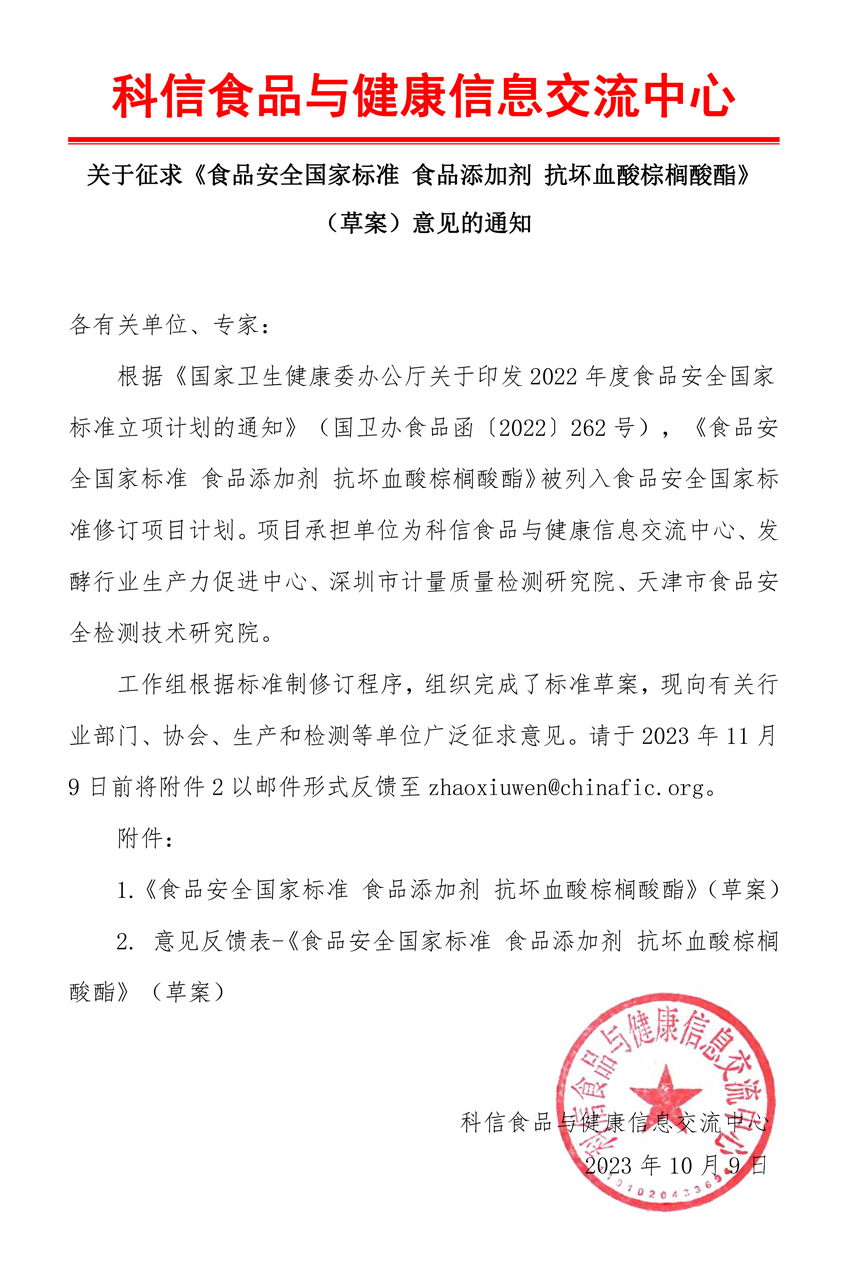 关于征求《食品安全国家标准 食品添加剂抗坏血酸棕榈酸酯》(草案)意见的通知