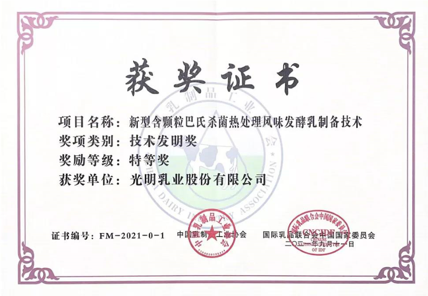 近日,中国乳制品工业协会第二十七次年会在杭州召开,本次年会是由中国乳制品工业协会、国际乳品联合会中国国家委员会(CNCIDF)联合举办。中国乳制品工业协会组织评选了2021年度中国乳业科技系列奖项,其中的奖项包括技术发明奖和技术进步奖,并于第二十七届年会期间举办了颁奖仪式。在本次评选中,光明乳业参评项目《新型含颗粒巴氏杀菌热处理风味发酵乳制备技术》获得了技术发明特等奖。
