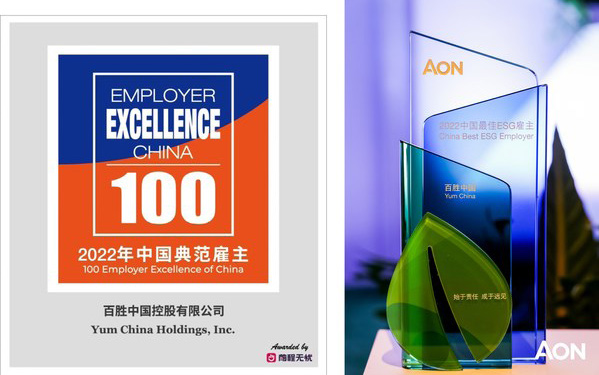 此次,百胜中国荣获怡安颁发的“中国最佳 ESG雇主”奖项,该奖项从责任、韧性、敏捷与演进四大维度进行综合评估,关注企业社会责任、健康及有韧性的组织生态、高效治理结构以及未来发展潜力等。同时,公司荣获前程无忧颁发的 2022 中国 100 典范雇主之“企业 ESG 影响力典范”。该评选自 2008 年举办至今,是国内最具有影响力的人力资源管理领域的选拔之一,一直致力于展现中国人才管理的高级水平,表彰在人才吸引、培养和关爱方面持续投入,并藉此获得卓越业绩的典范雇主。