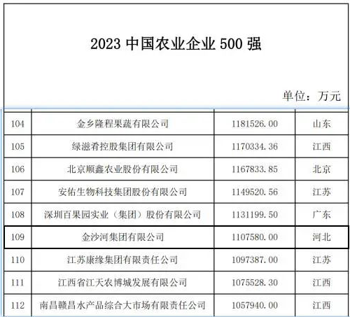 为全面、客观、系统展现我国农业企业发展情况,营造农业企业参与乡村振兴和建设农业强国的良好社会氛围,农民日报社发起2023 中国农业企业 500 强评价活动,经信息汇集、严格审核、专家评议等程序,形成了《2023 中国农业企业 500 强》,金沙河集团入选中国农业企业 500 强。