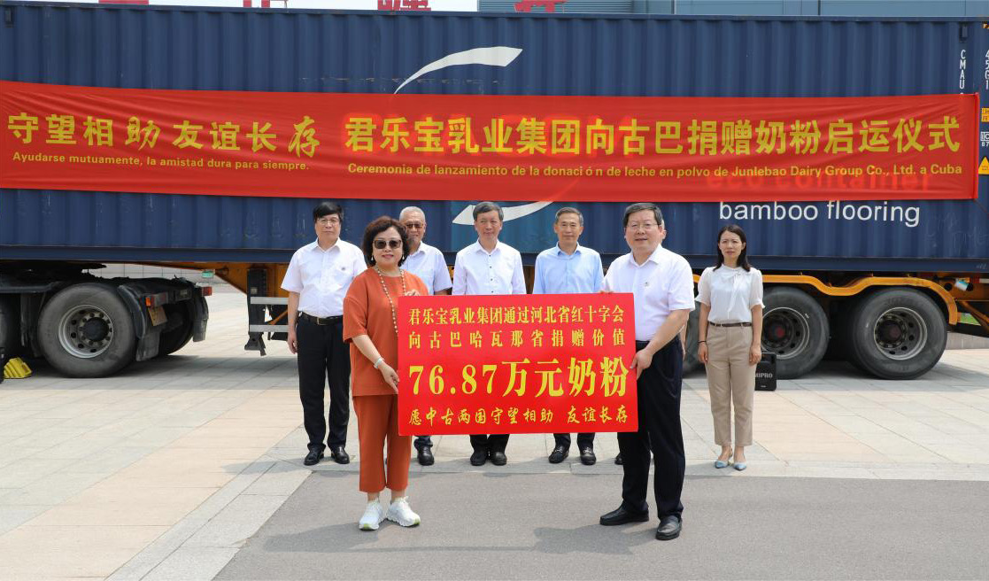 7月10日,君乐宝乳业集团向古巴捐赠奶粉启运仪式在君乐宝奶粉工厂举行。河北省商务厅一级巡视员任会君,河北省外办二级巡视员孙茂章,河北省红十字会党组书记、常务副会长李林龙等相关领导,以及君乐宝乳业集团董事长兼总裁魏立华、副总裁仲岩出席活动。此次君乐宝捐赠一批价值 76万余元的高钙奶粉,旨在为哈瓦那省人民带来健康和营养,为河北省高水平对外开放做出企业贡献。